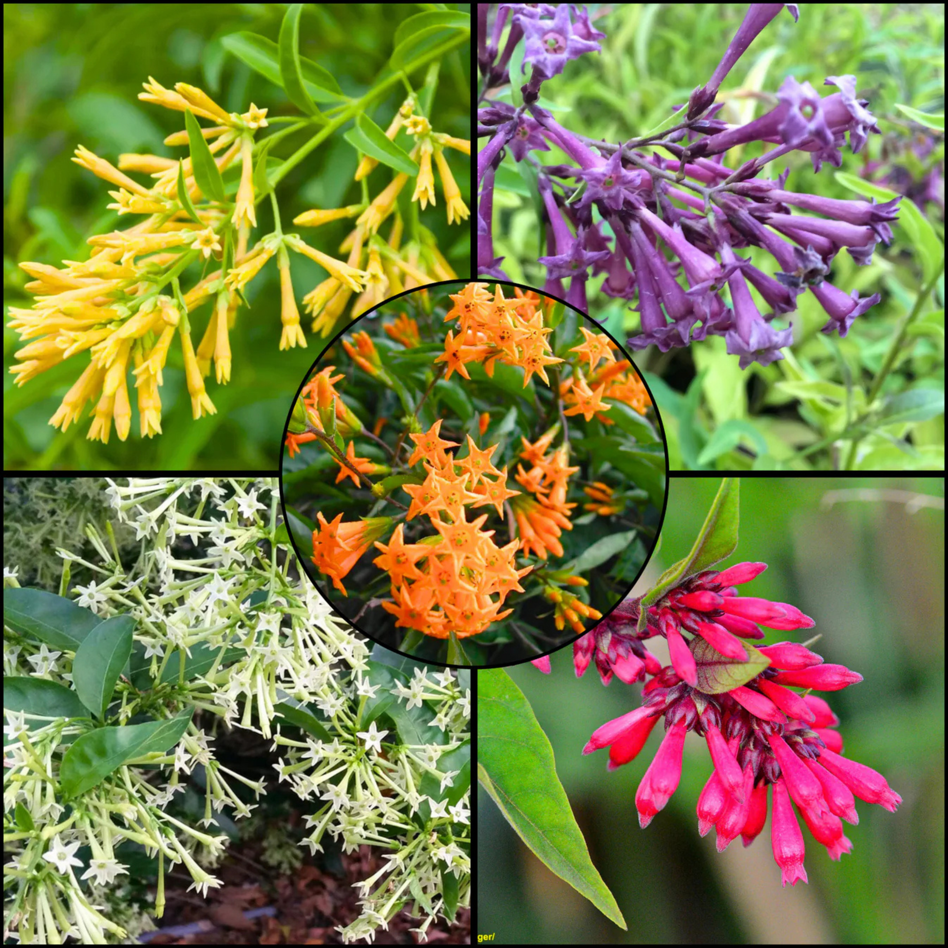 Combo includes White, Red, Orange, Purple & Yellow Night Blooming Jasmine live plants.